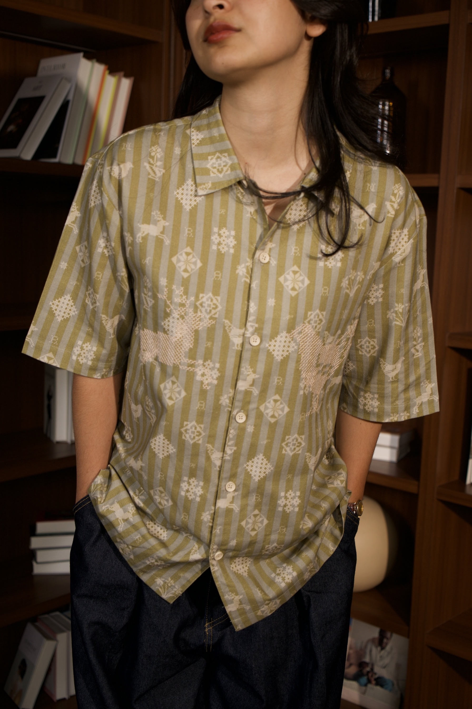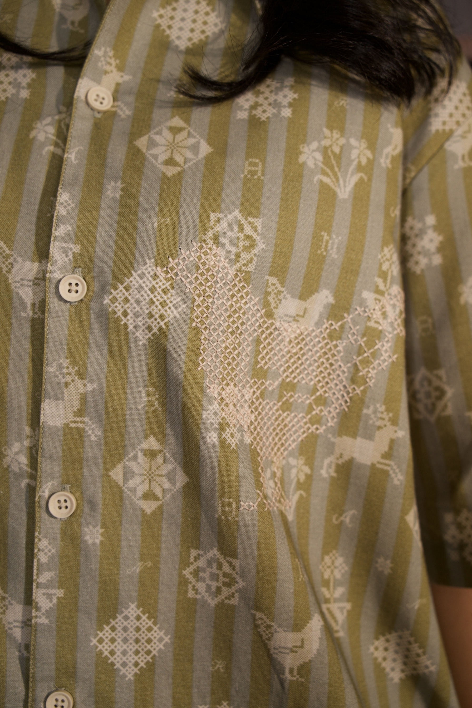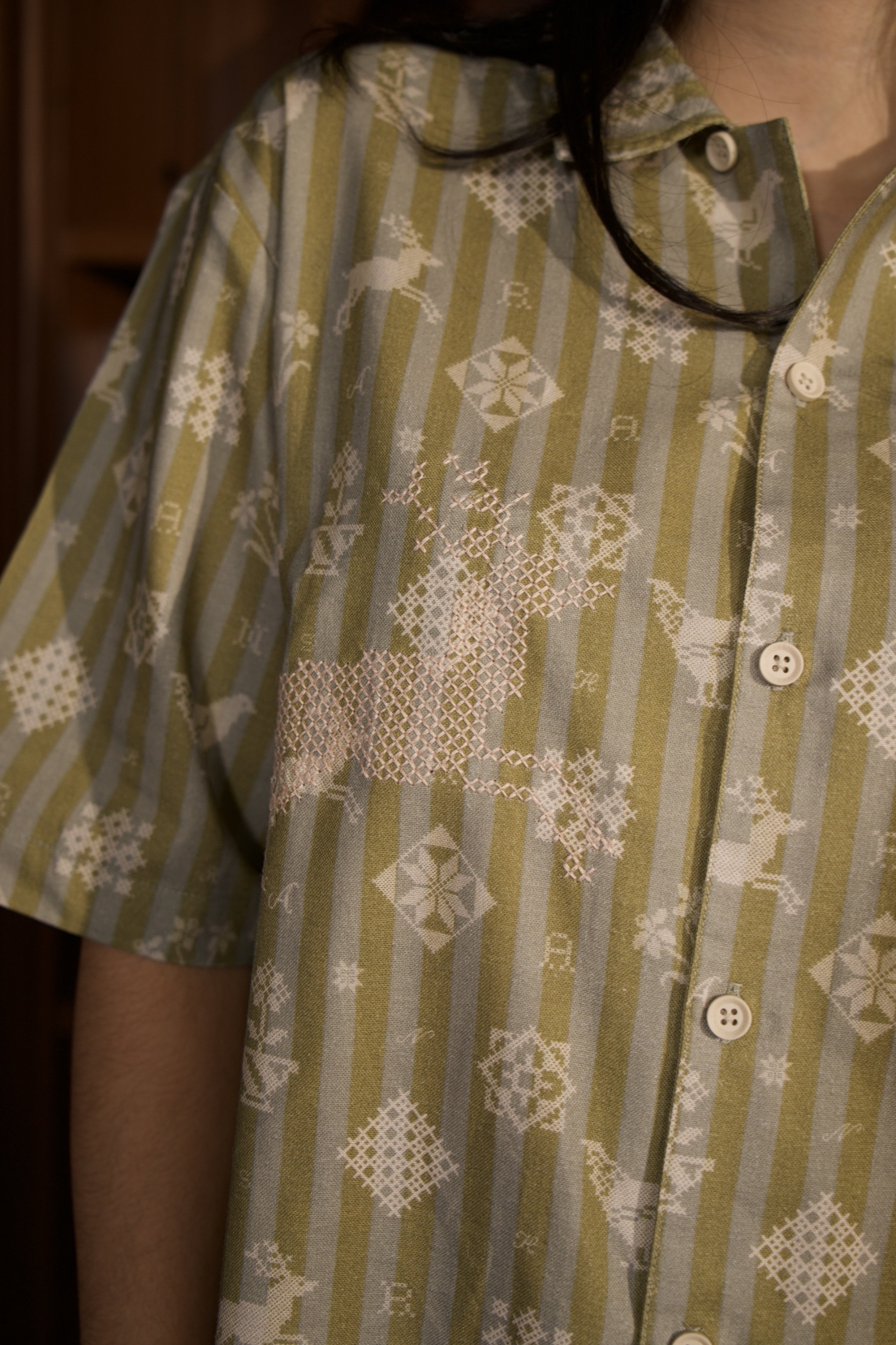 A shirt made from soft and comfortable organic cotton, featuring a fully printed motif and cross-stitch embroidery details on both the left and right sides.