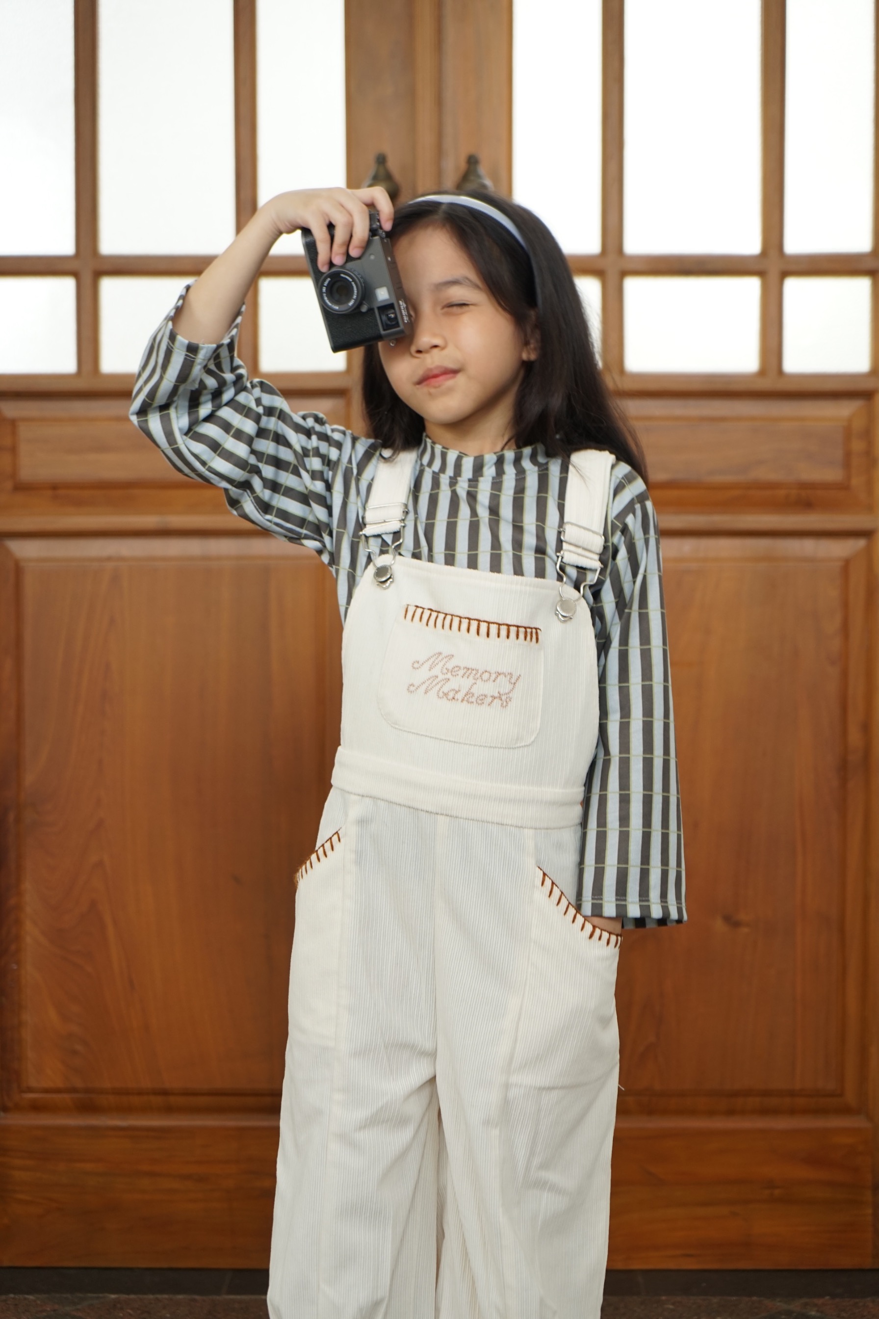 A kids’ corduroy overall featuring “Memory Makers” stitch embroidery and hand-stitched pocket details that beautifully enhance the overall look.