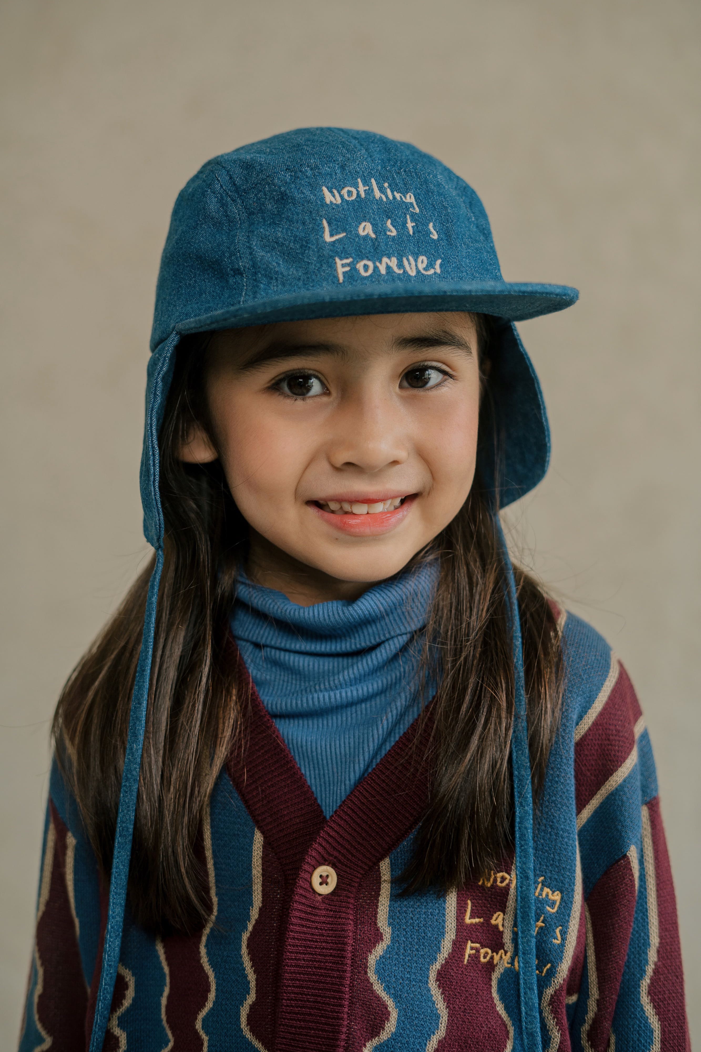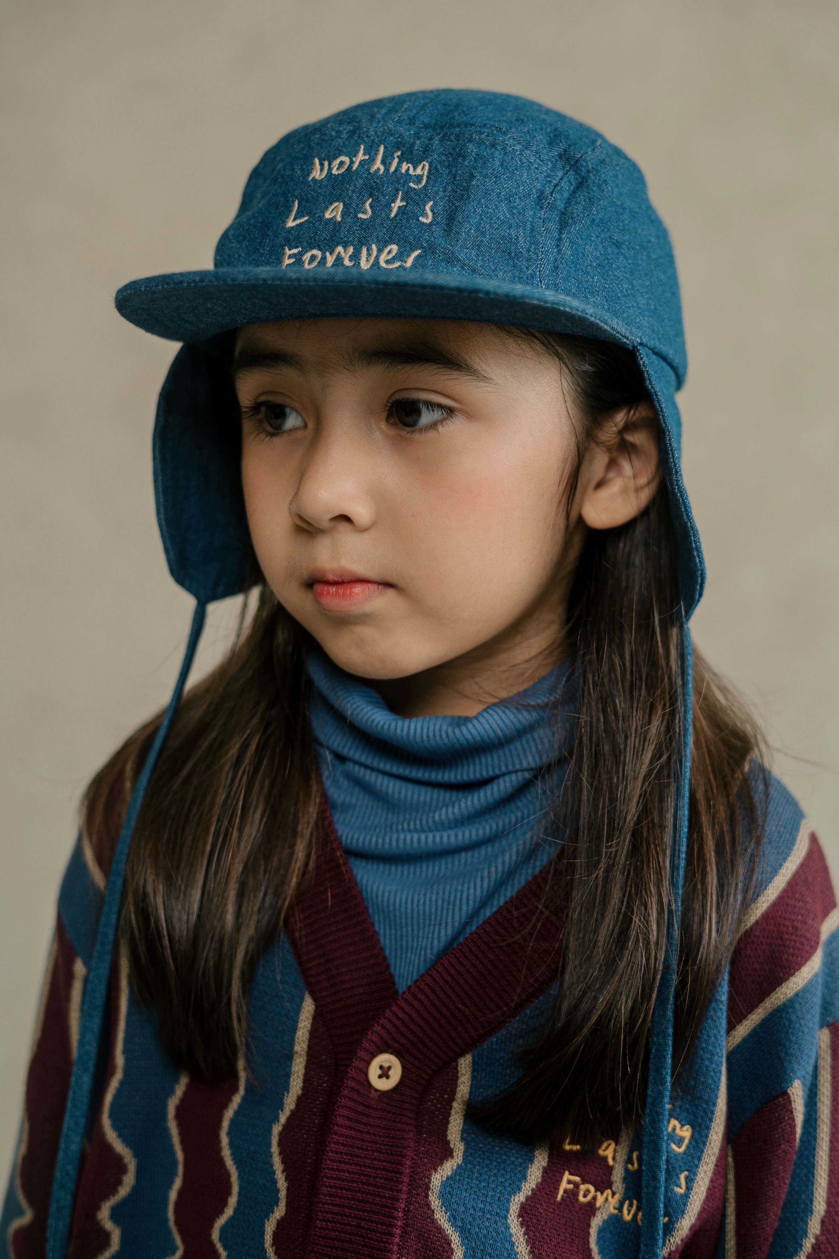 Topi denim dengan detail penutup telinga dan penutup yang dapat disesuaikan di bagian belakang.