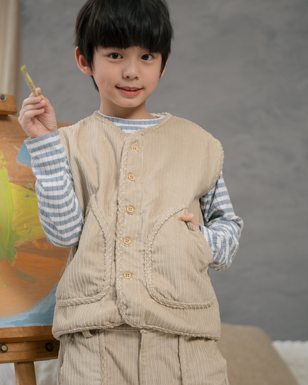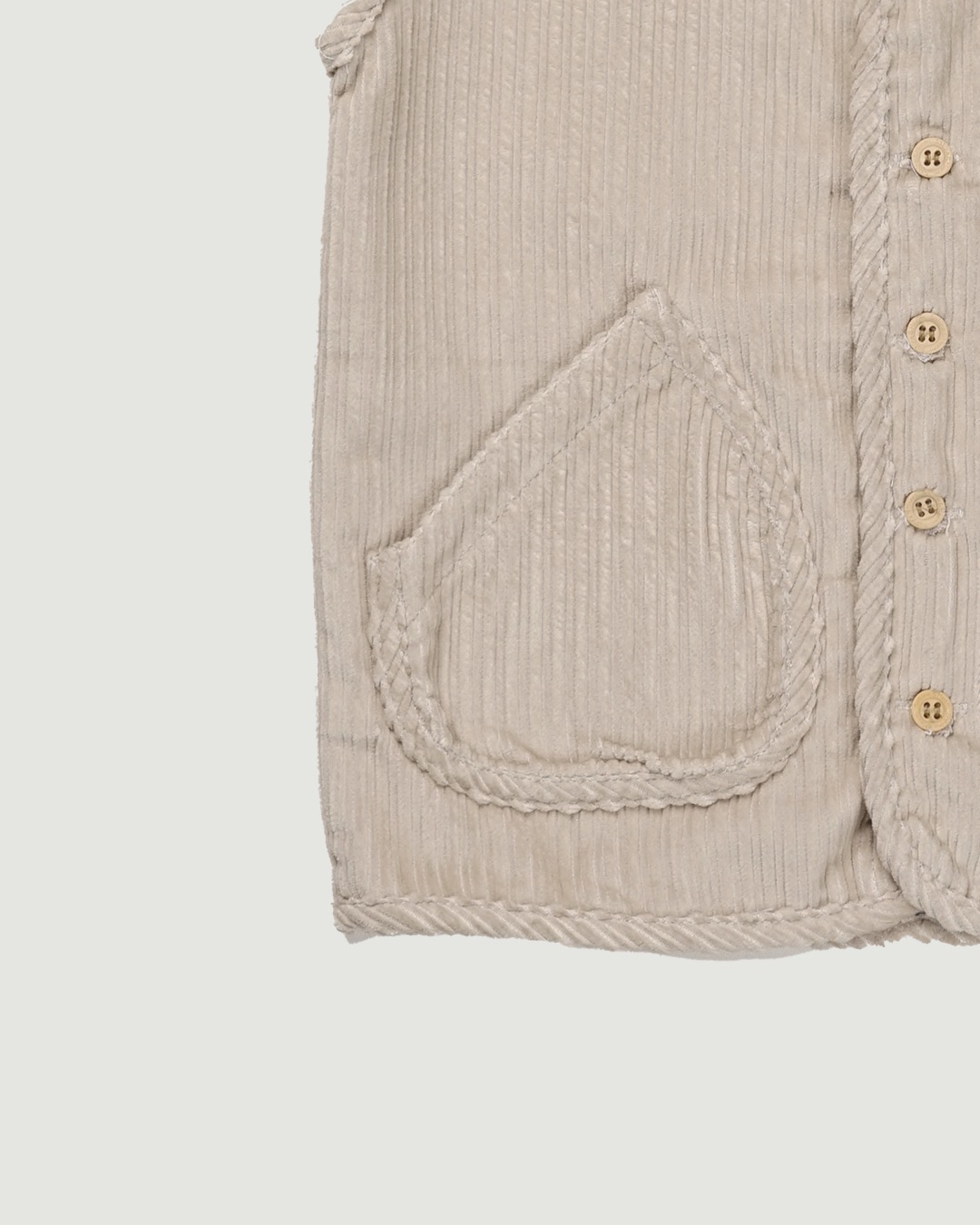 Children's vest made of soft premium corduroy, featuring pockets and wooden buttons on the front.