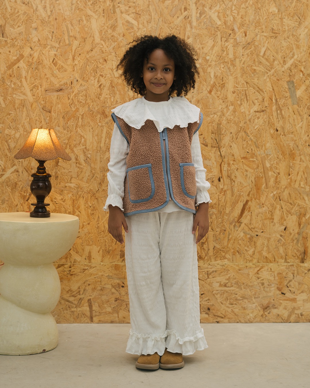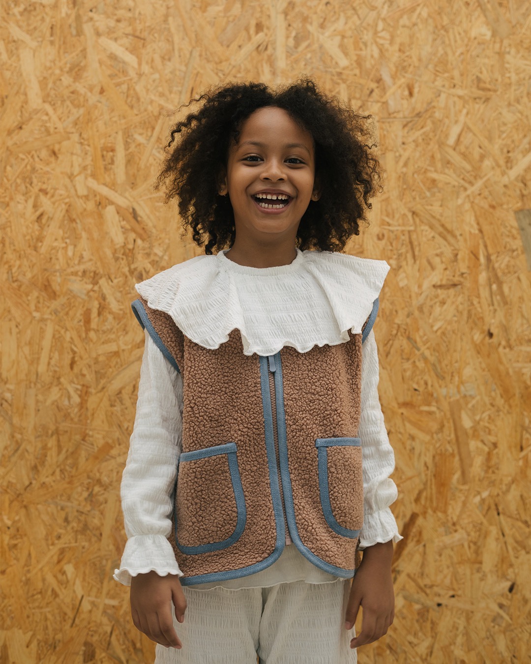 Children's vest made of ultra-soft sherpa fur, featuring denim trim details on the sides and pockets.