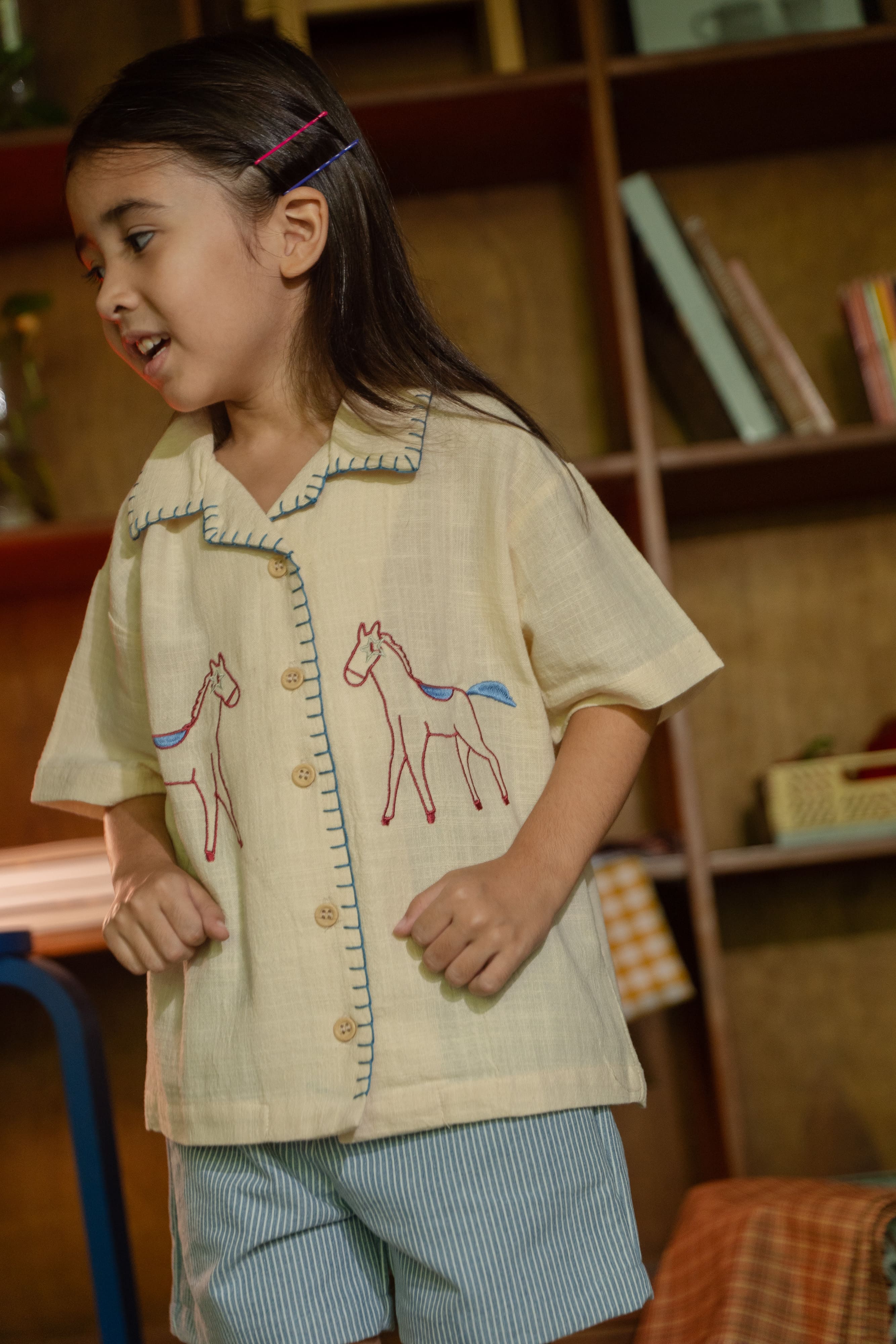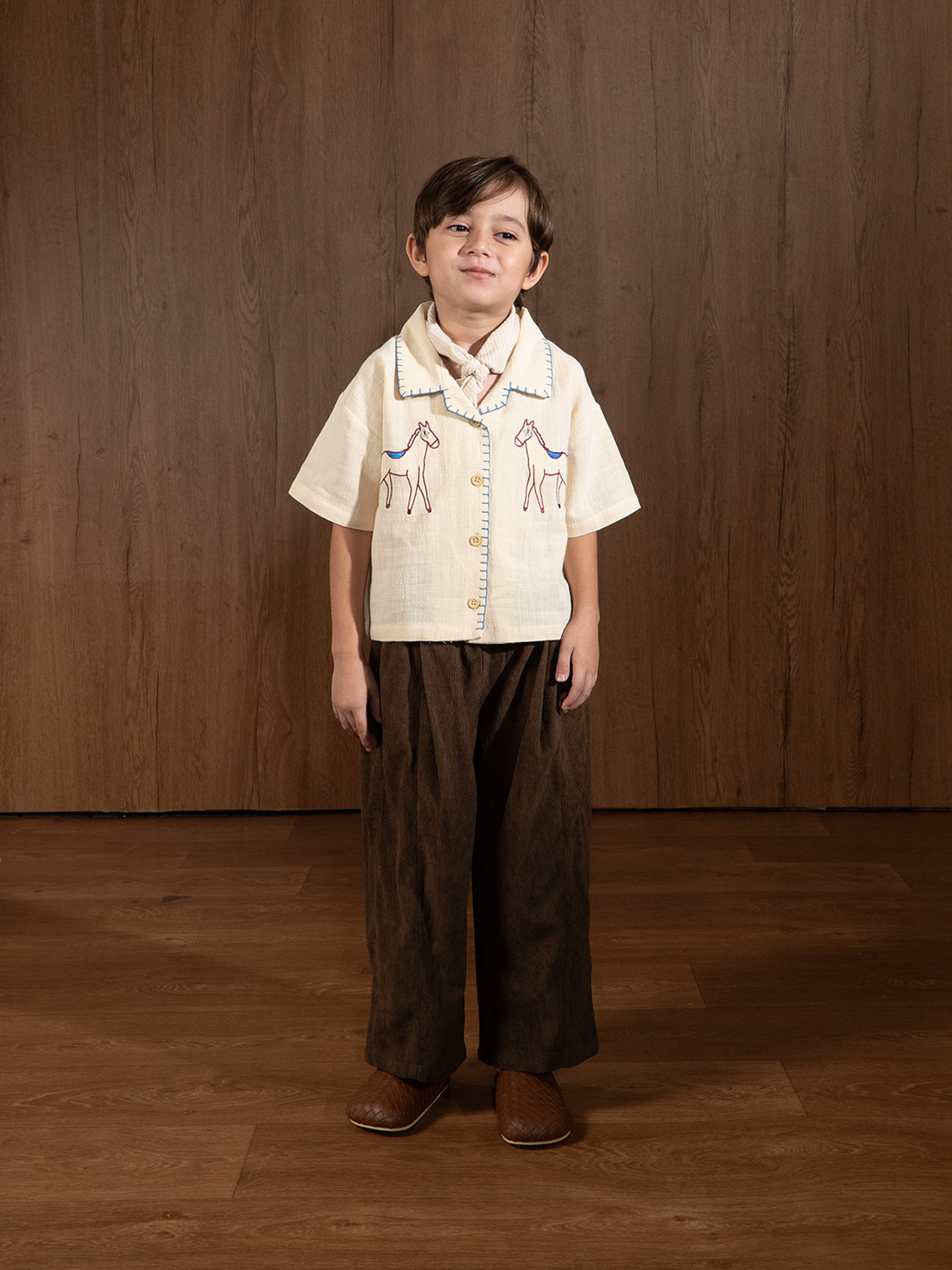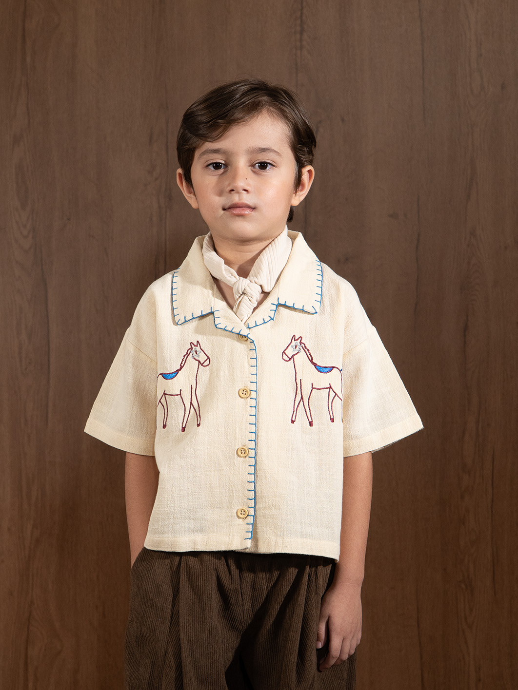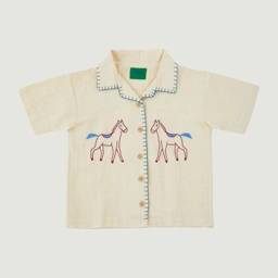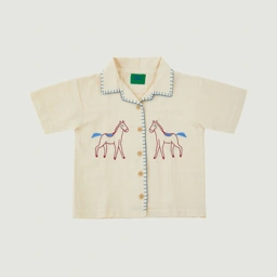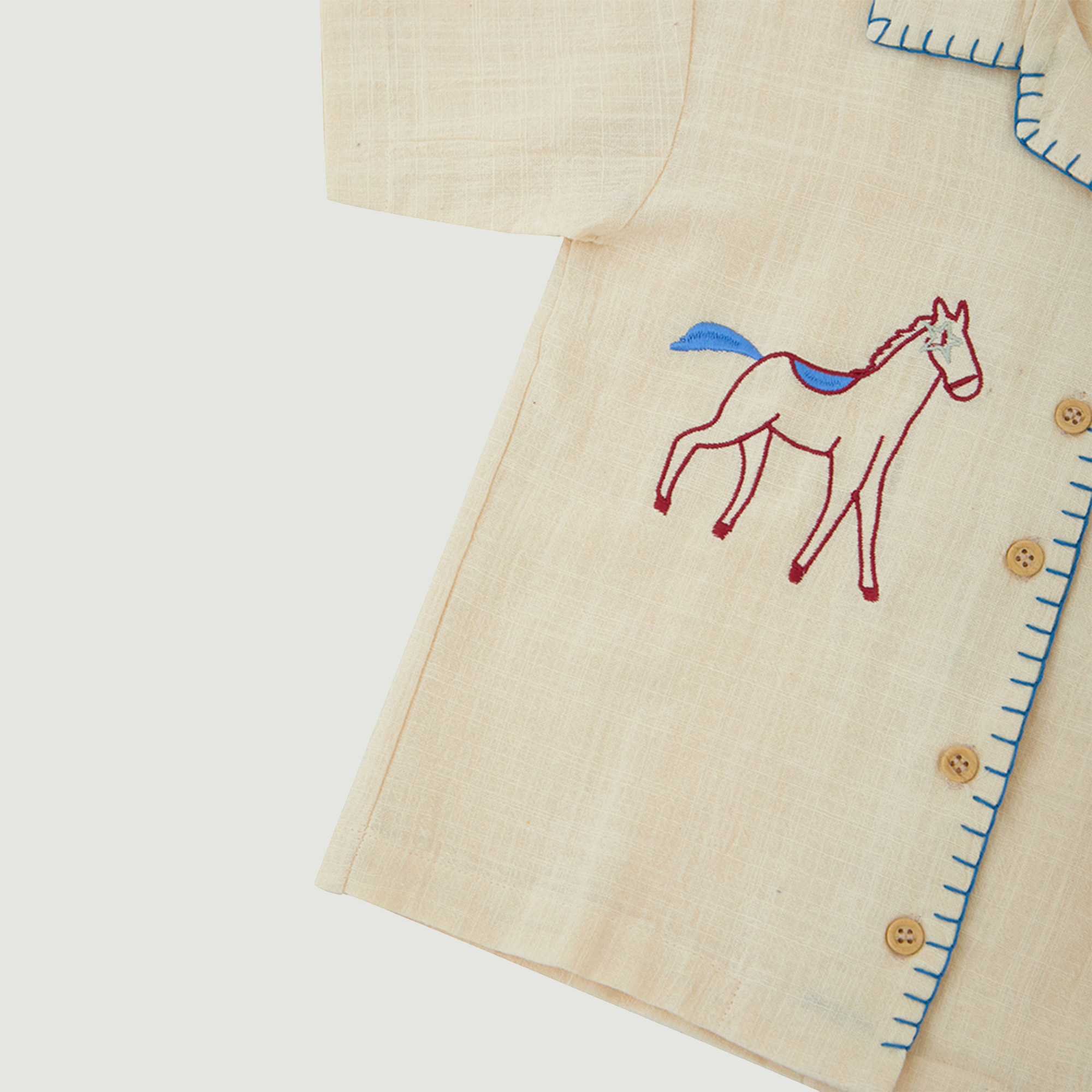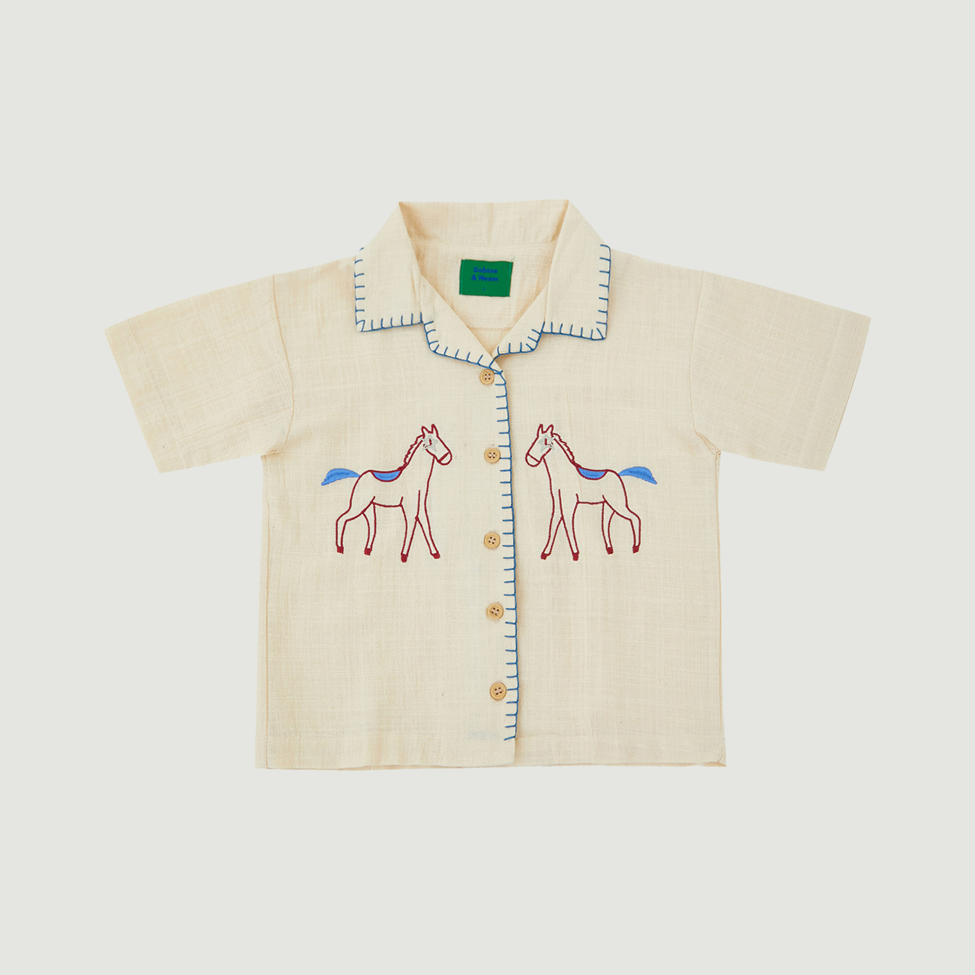 Linen shirt dengan embroidery detail two side pada tampak depan dan detail handmade sashiko pada kerah dan area kancing. Bahan menyerap keringat