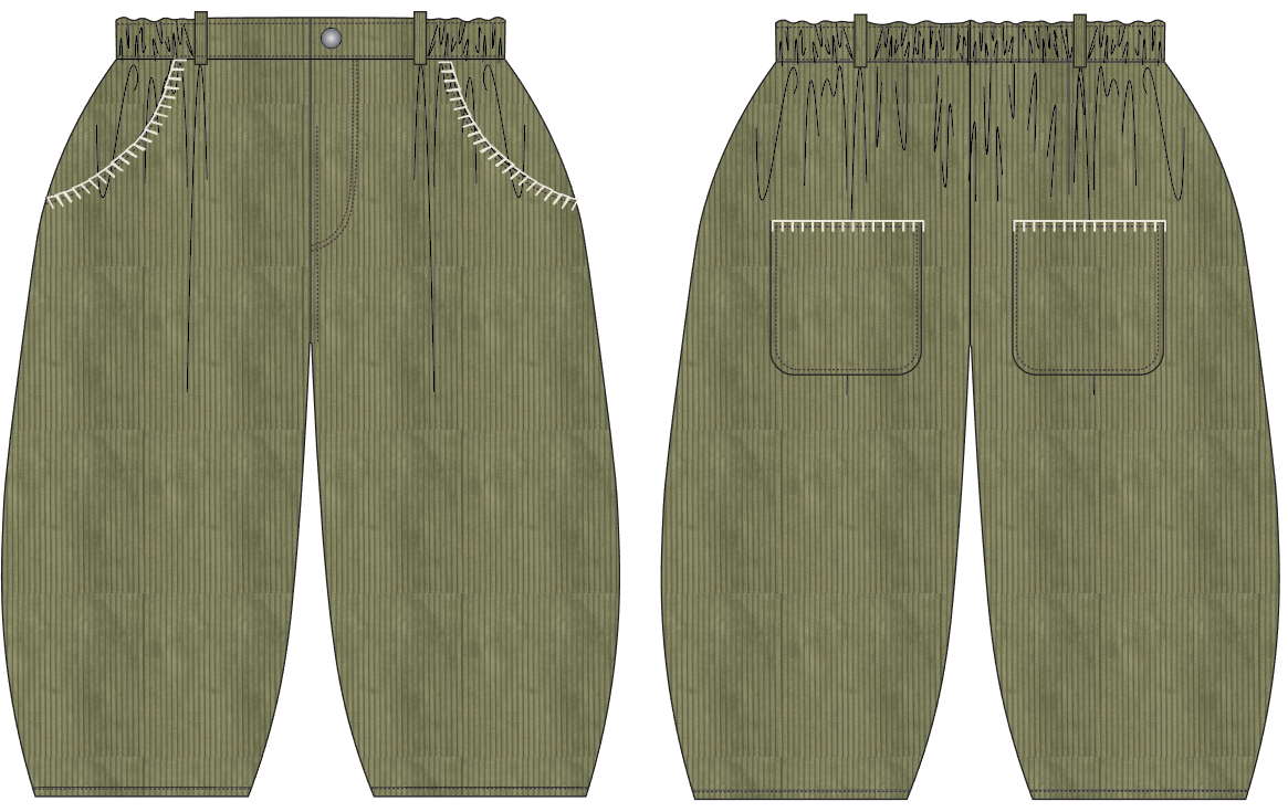 OLIVE Yellow Balloon Pants, children’s pants made from premium corduroy with a balloon cut, featuring a front button and a fully elastic waistband. Accented with handmade sashiko details on the front and back pockets, adding a unique and aesthetic traditional touch.