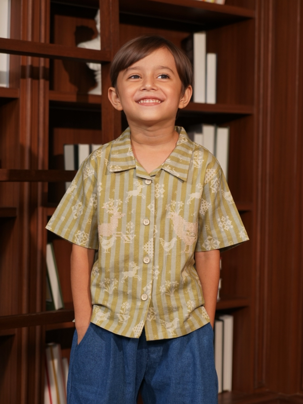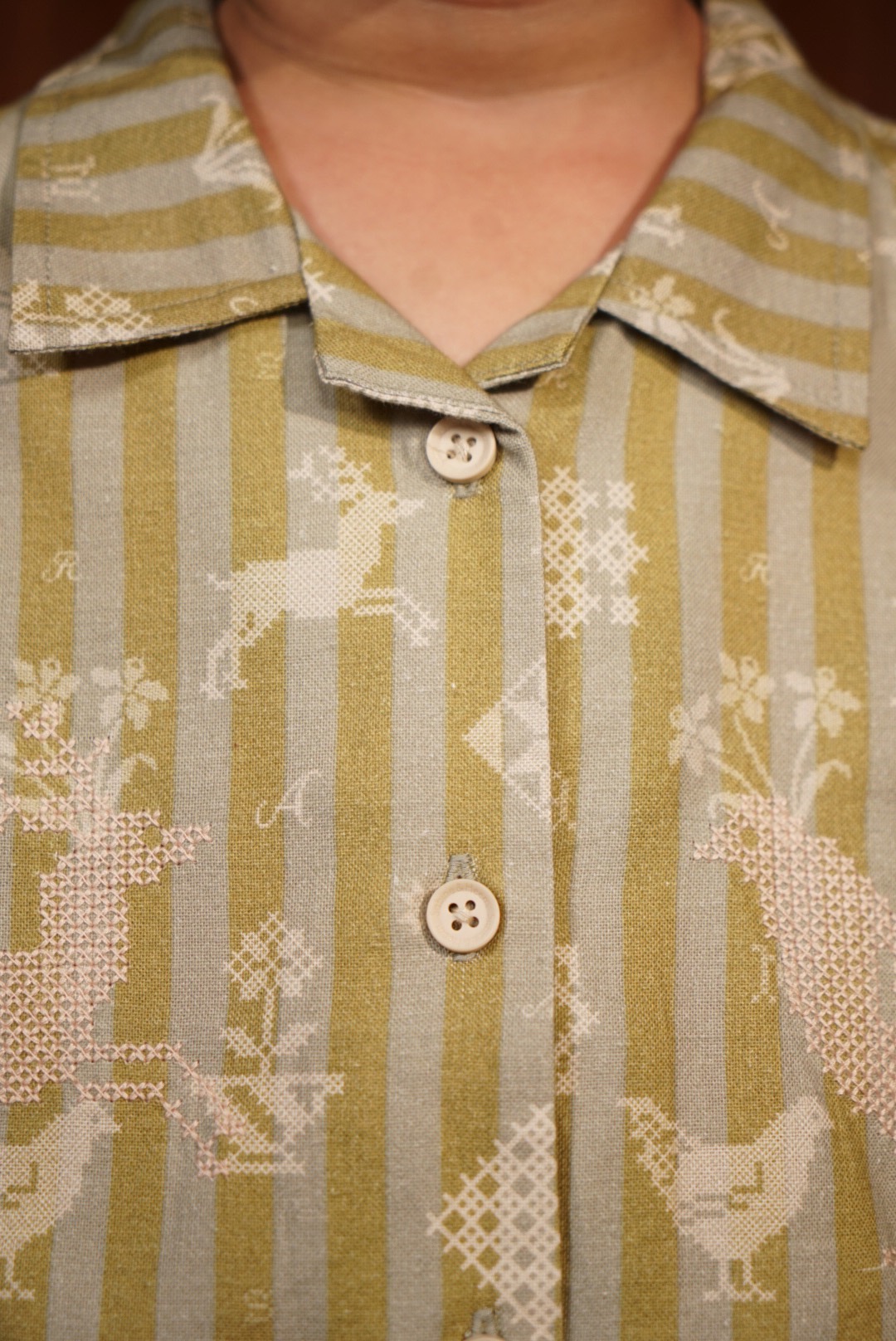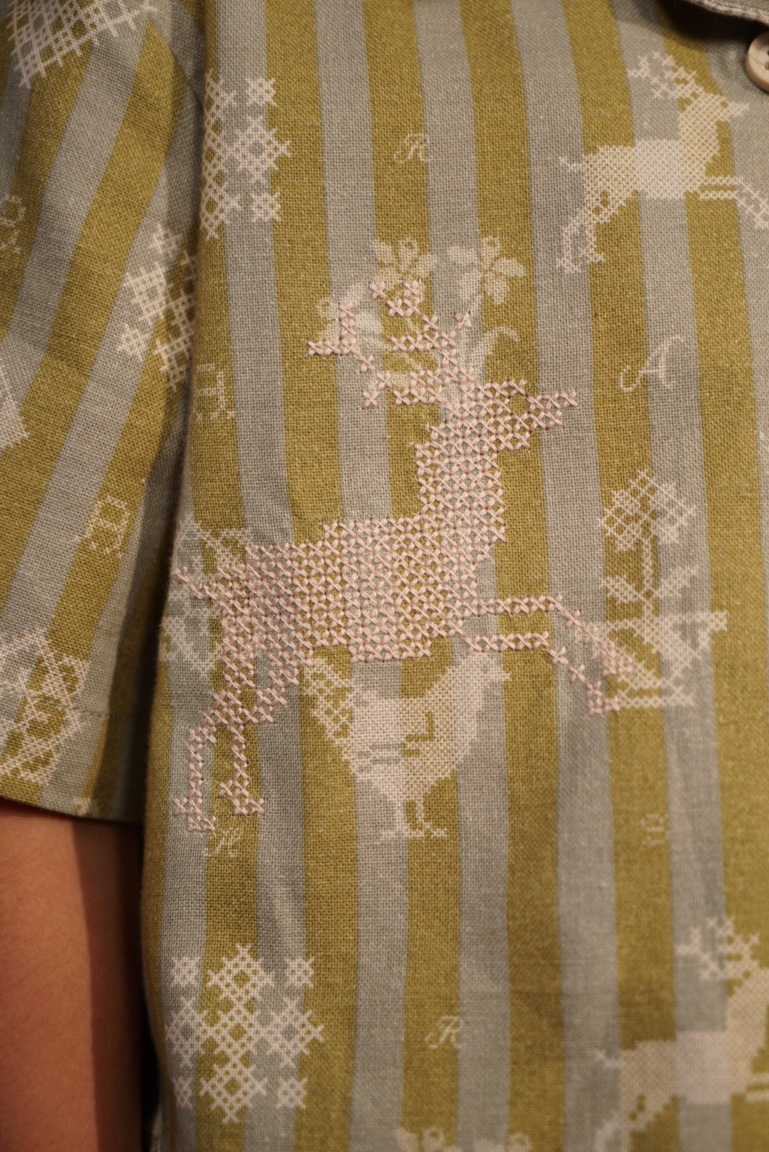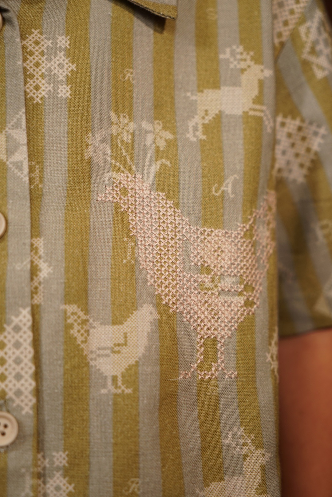 A shirt made from soft and comfortable organic cotton, featuring a fully printed motif and cross-stitch embroidery details on both the left and right sides.