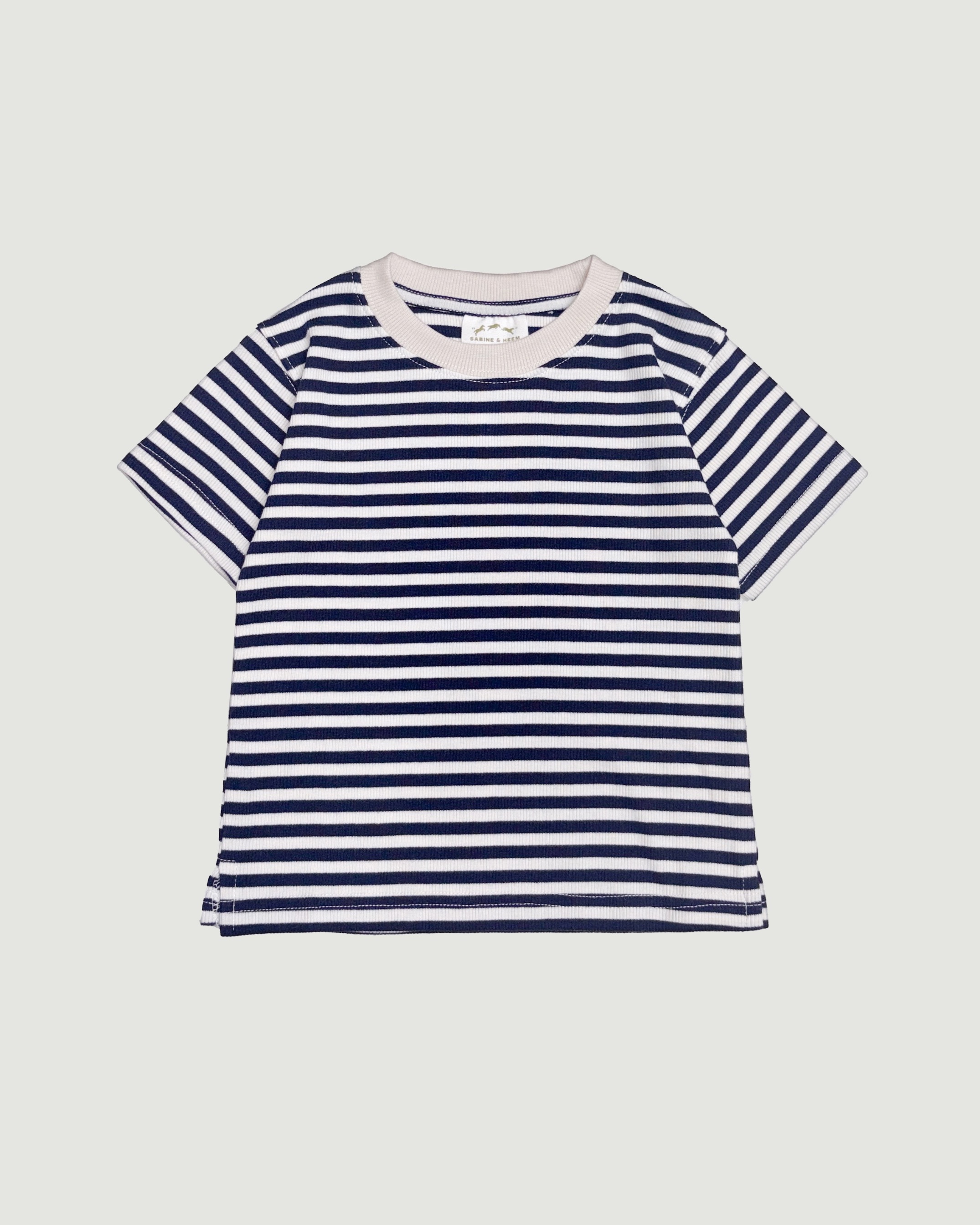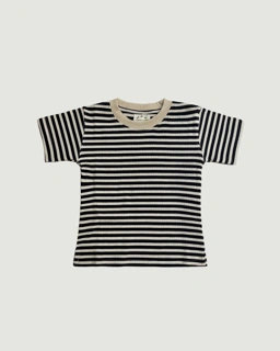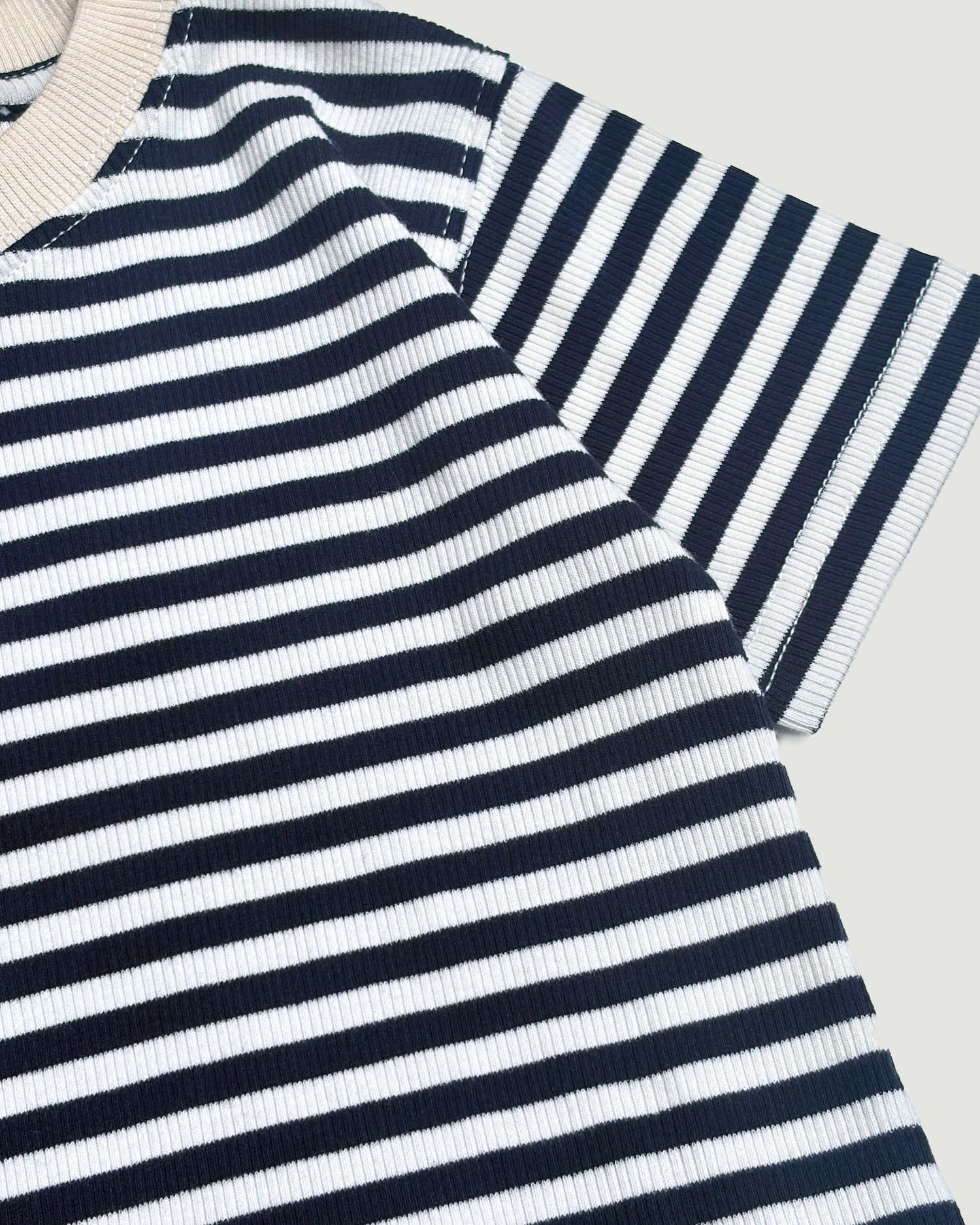 Children’s T-shirt made from cotton with a striped pattern and a ribbed collar. Lightweight, soft, and breathable.
