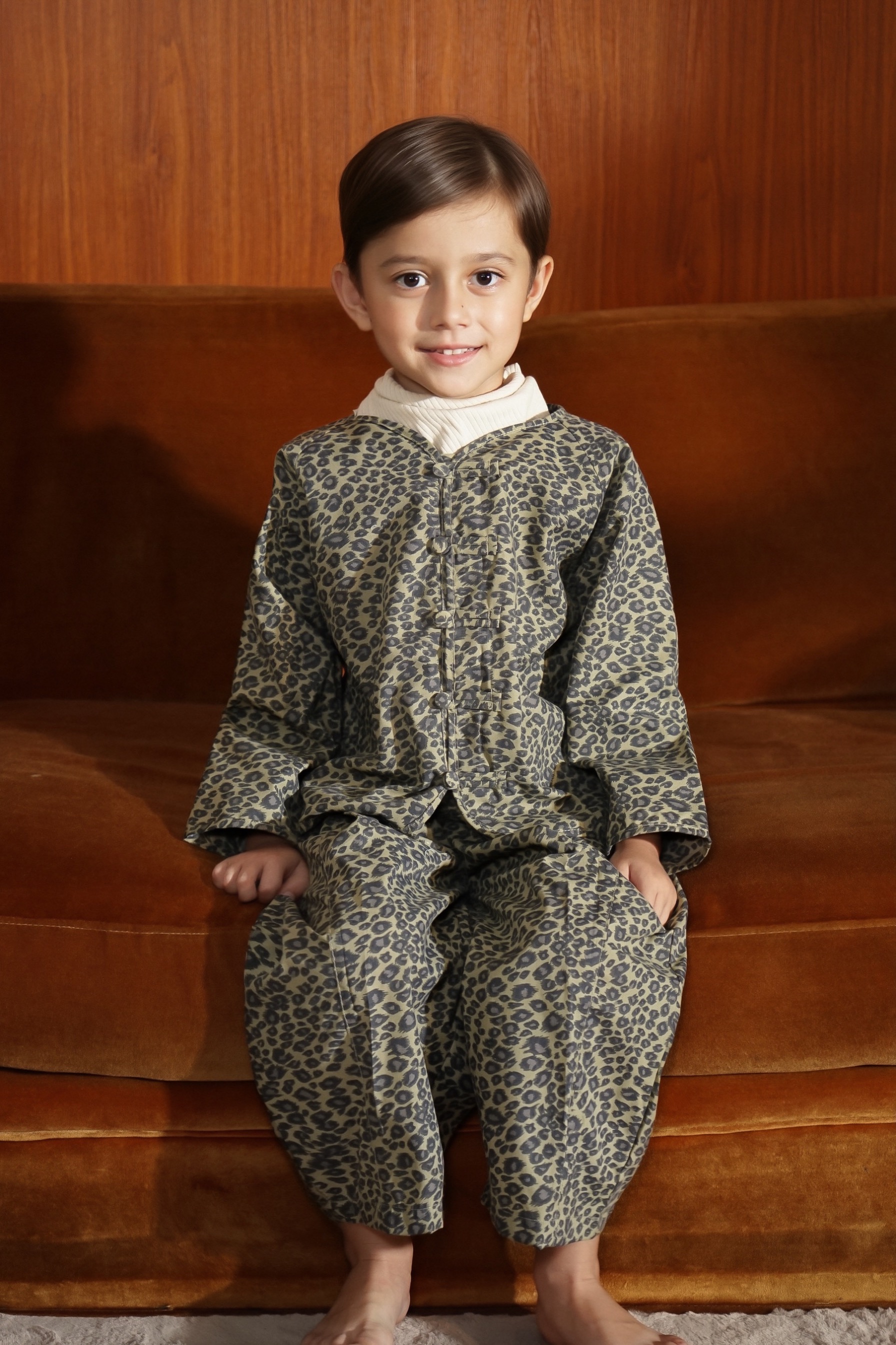 Children’s cotton shirt with a printed design that is lightweight and comfortable for everyday wear. Features cheongsam-style button details that add a modern classic touch, creating a neat yet relaxed look.