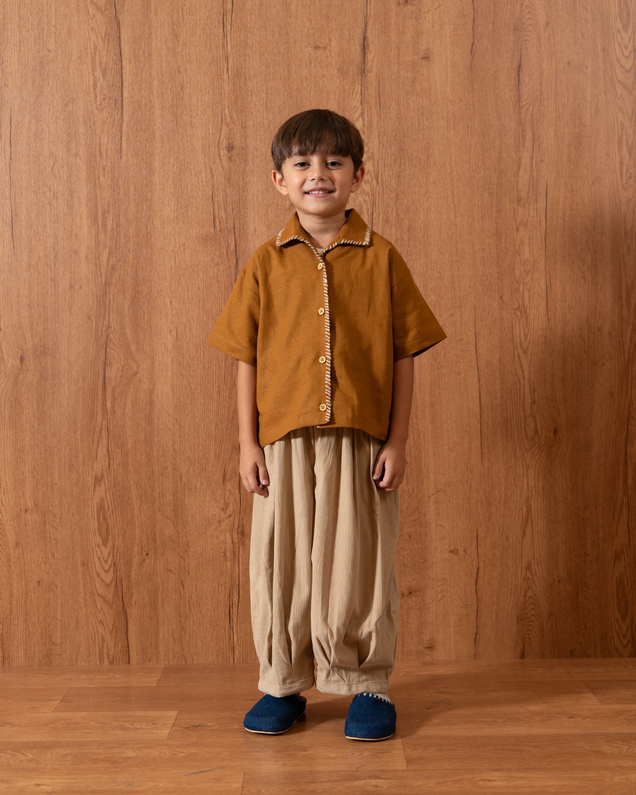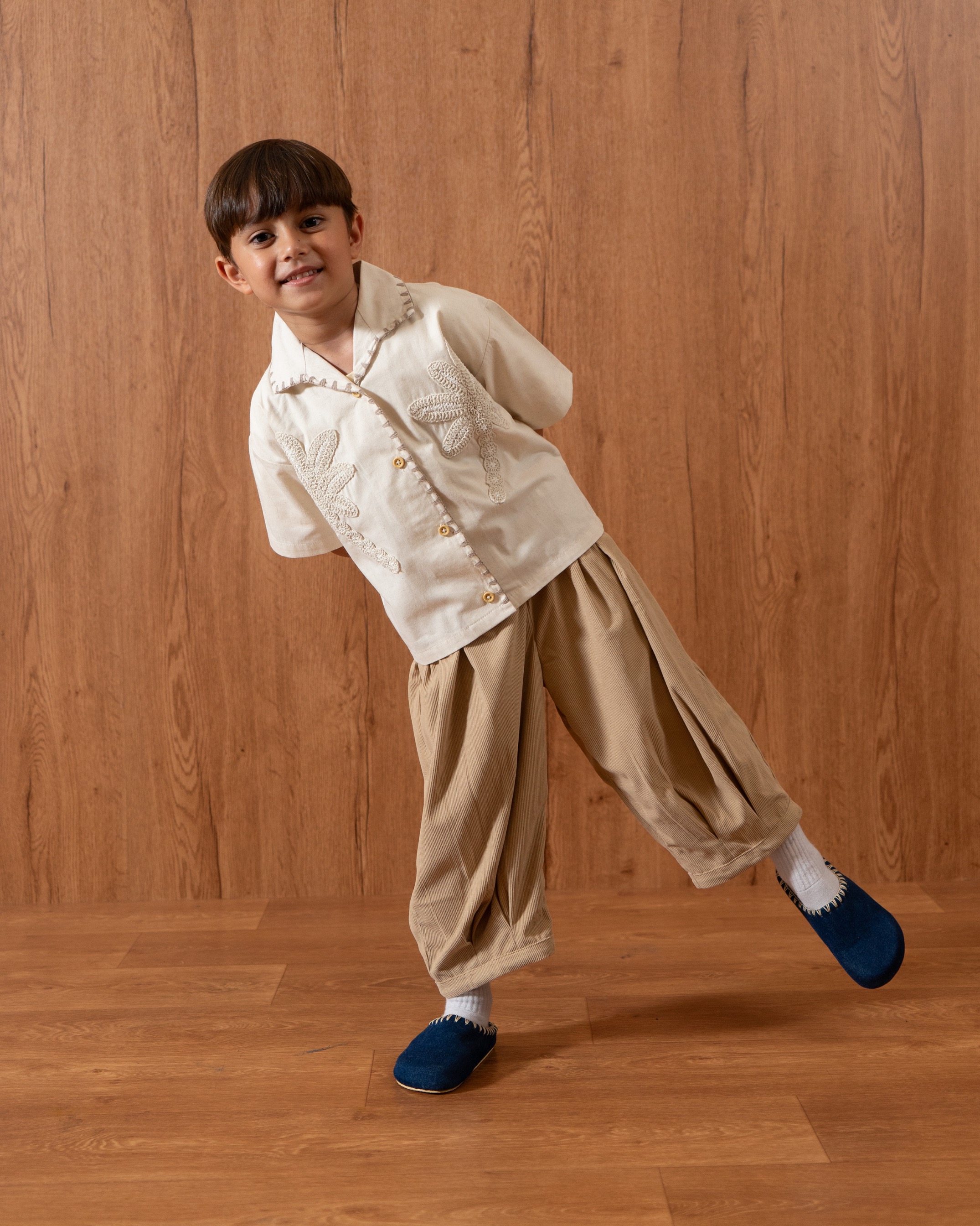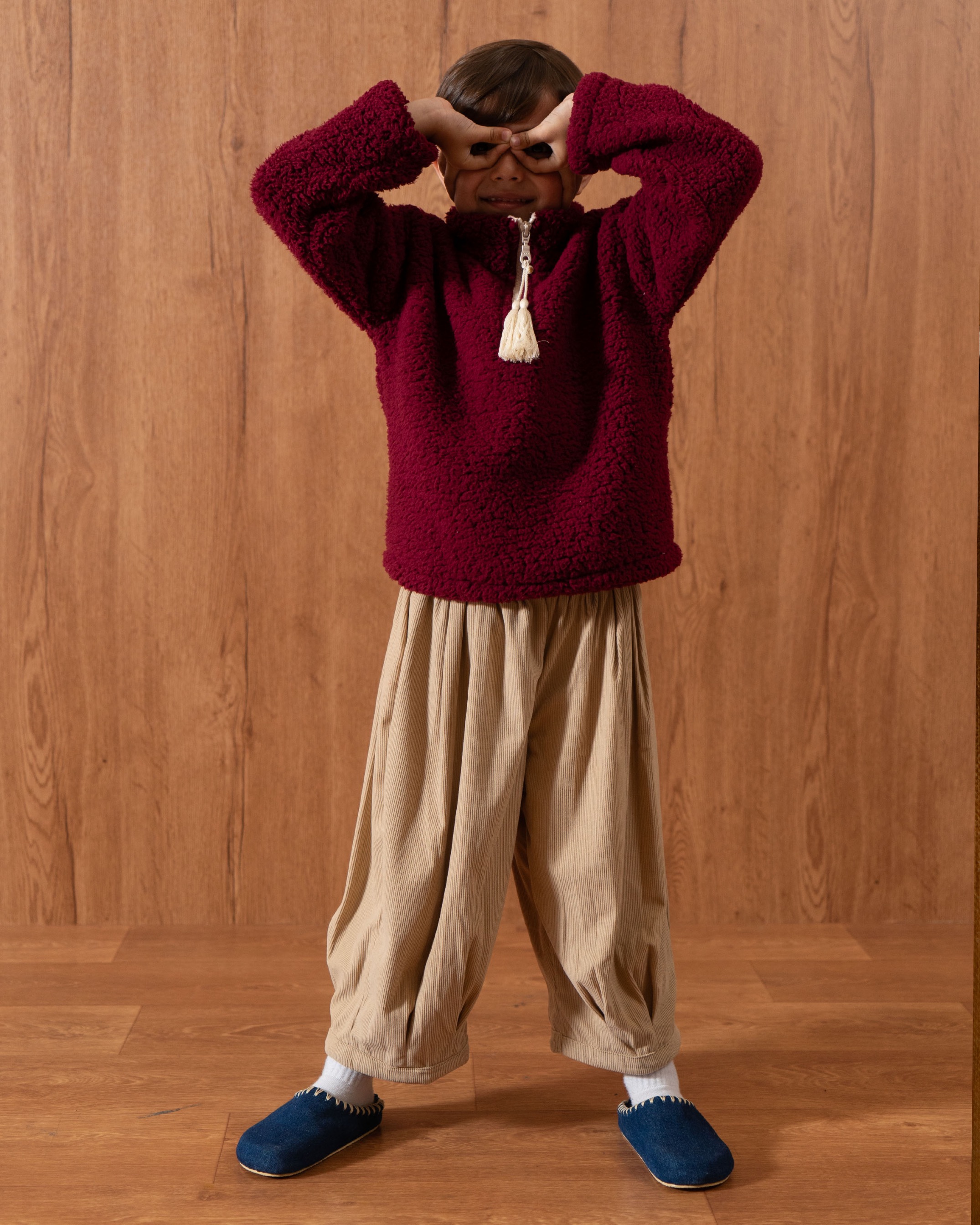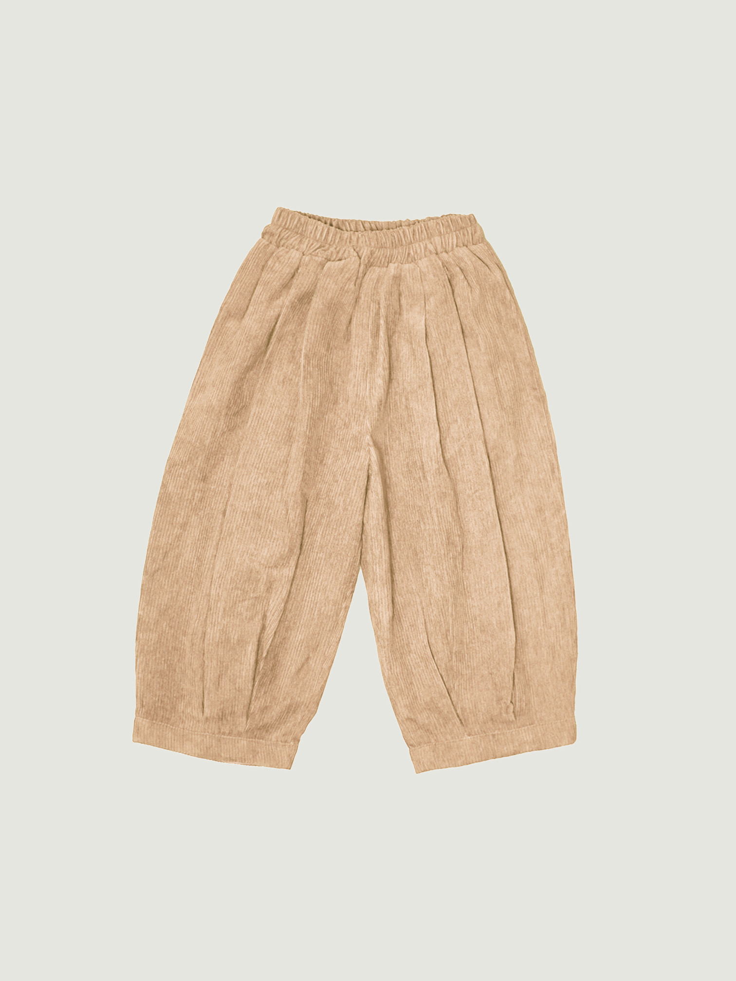 Kids’ pants made from corduroy with a balloon cut, featuring a fully elastic waistband. Very comfortable to wear.