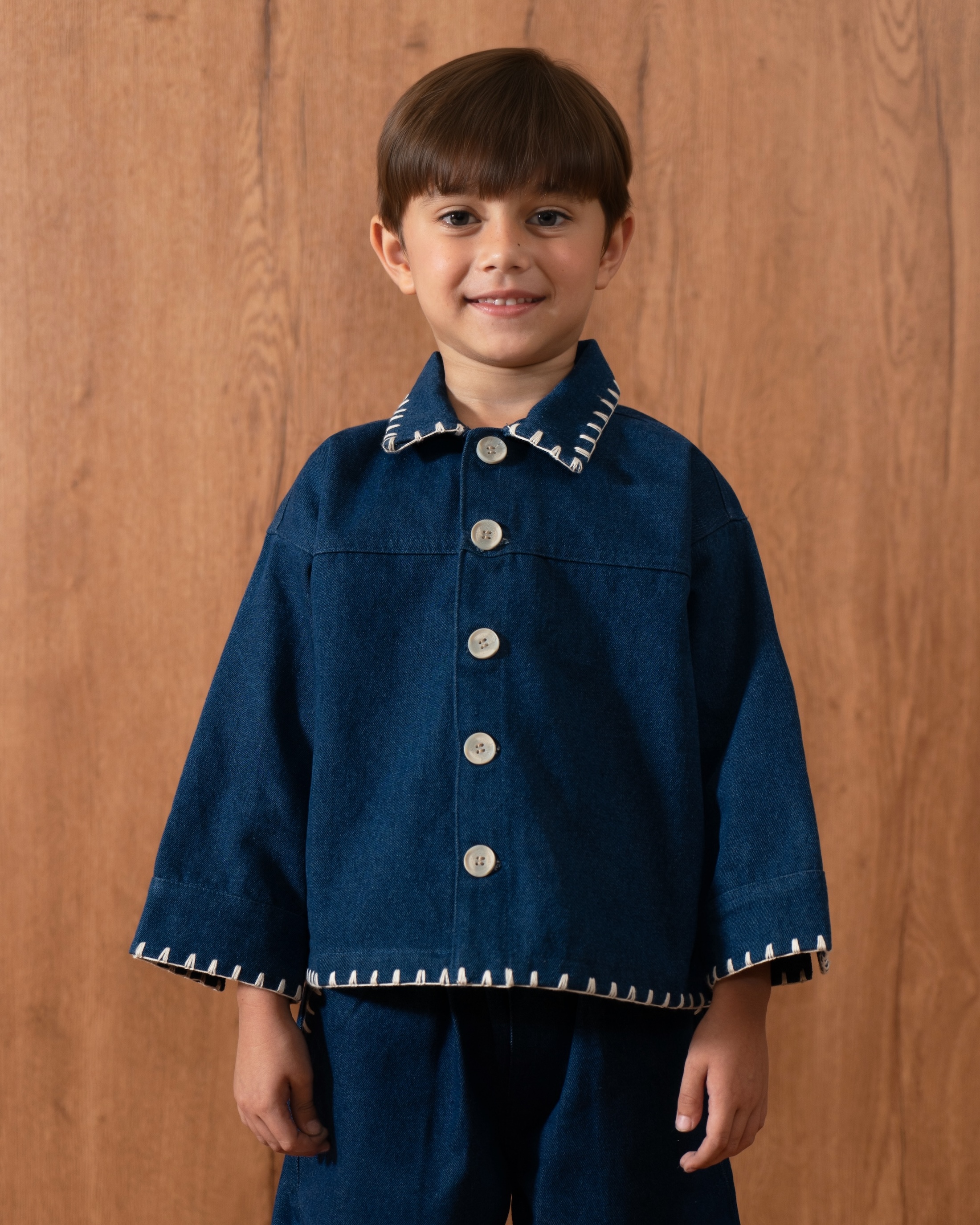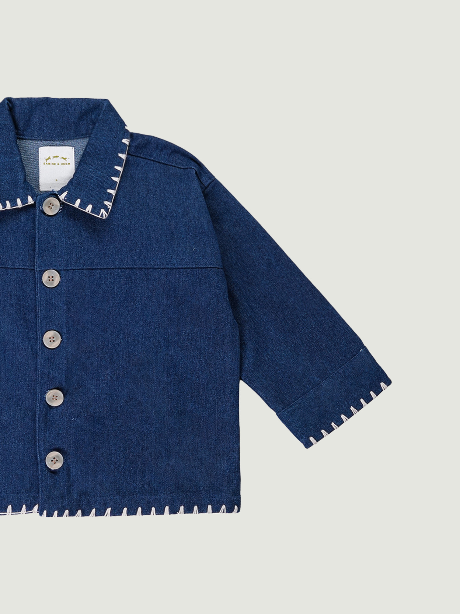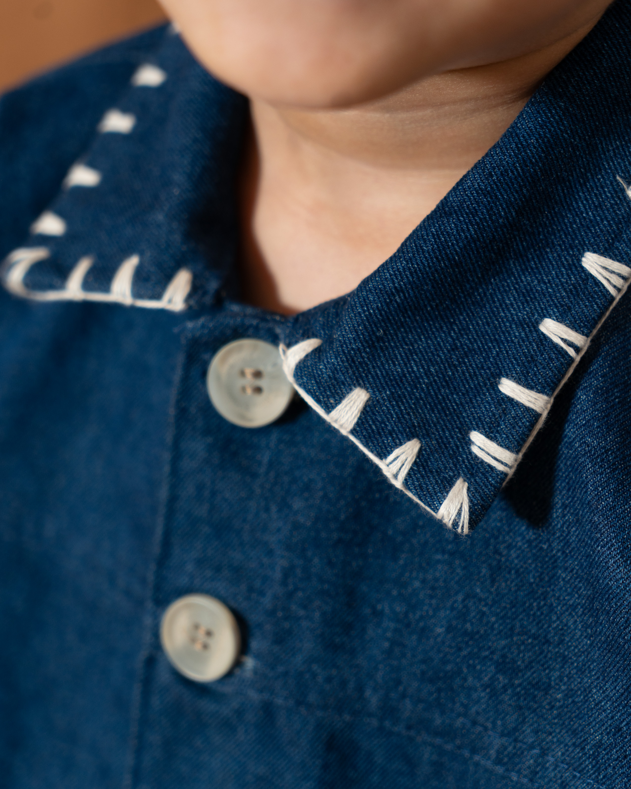 Handmade Sashiko detailing on the collar, sleeves, and hem