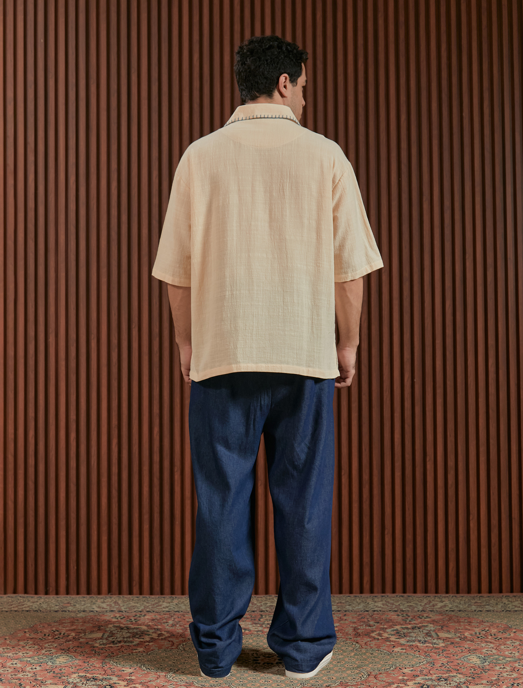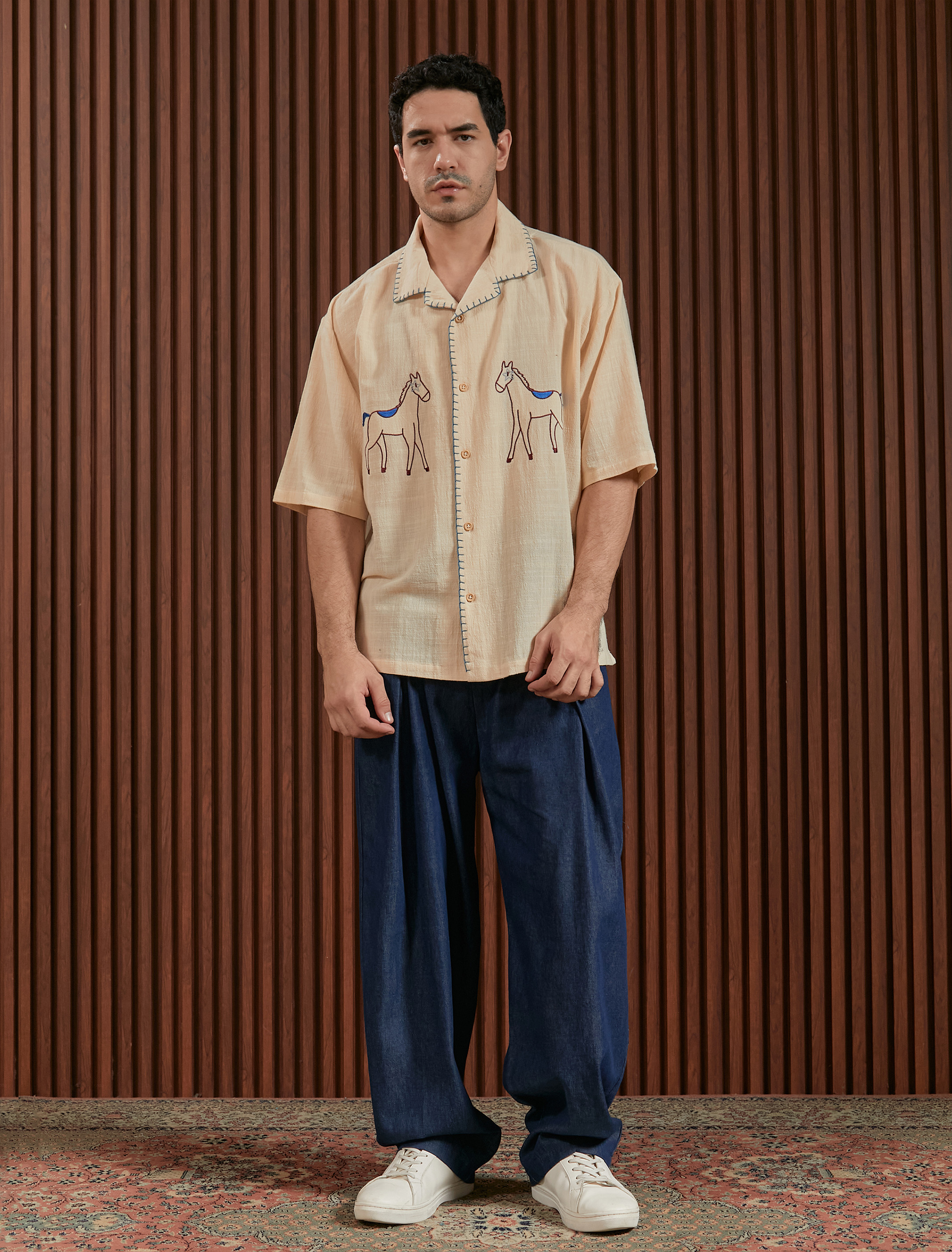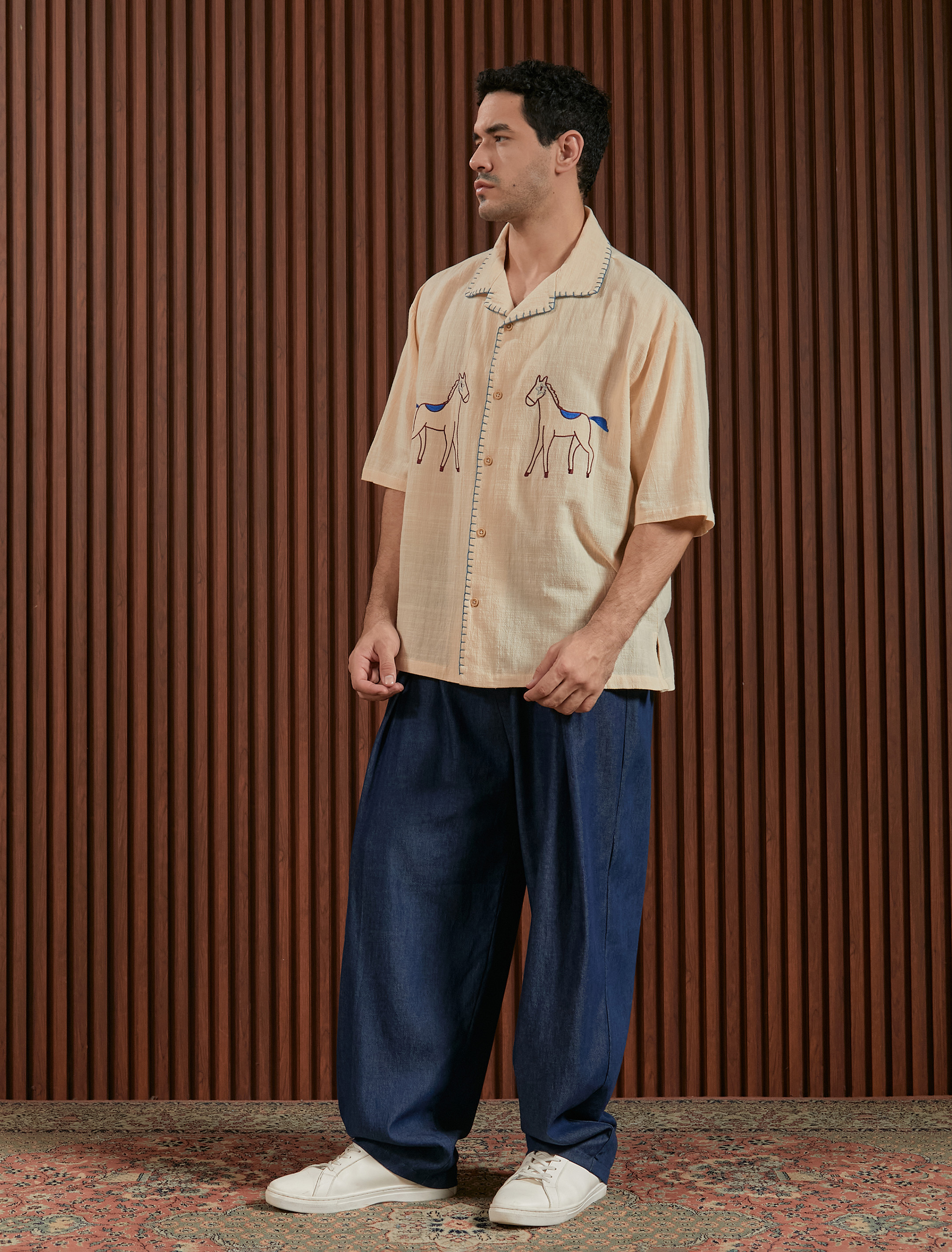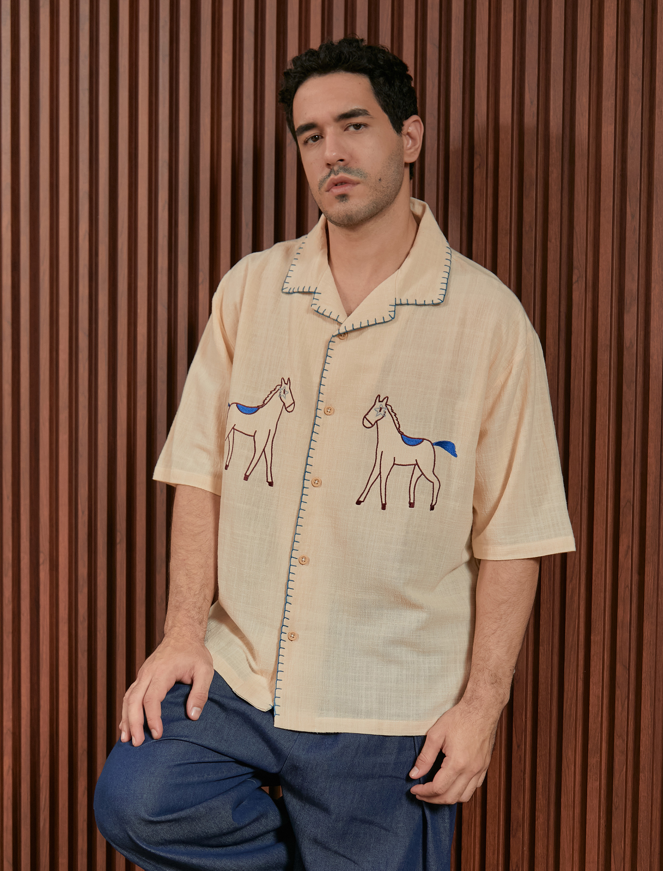 Linen shirt dengan embroidery detail two side pada tampak depan dan detail handmade sashiko pada kerah dan area kancing. Bahan menyerap keringat